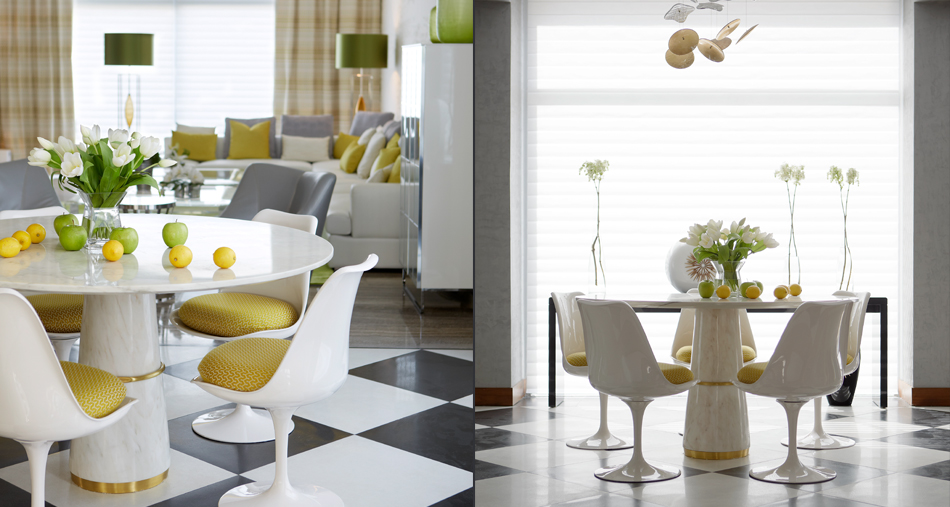 A twill armchair, a marble dining table and a contemporary brass chandelier are some of the pieces that can be seen there, among others.