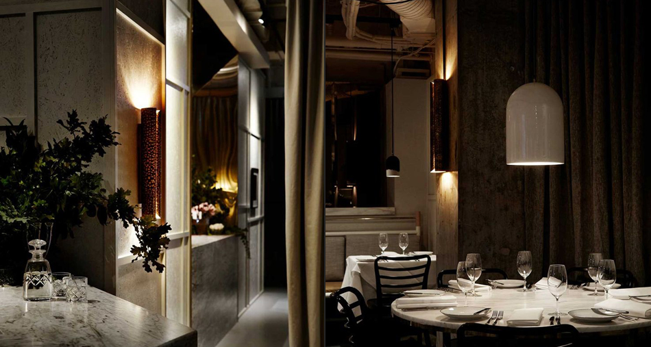 A physical expression of what is a bold, confident and directional move, the Prix Fixe dining room is formed from a material palette of mirror and marble, brass and metallic glazed linen, exposed ceiling fixtures and concrete. It’s moody yet inviting, lux yet raw, and undoubtedly dramatic. VELLUM contemporary wall lights were used in this project.